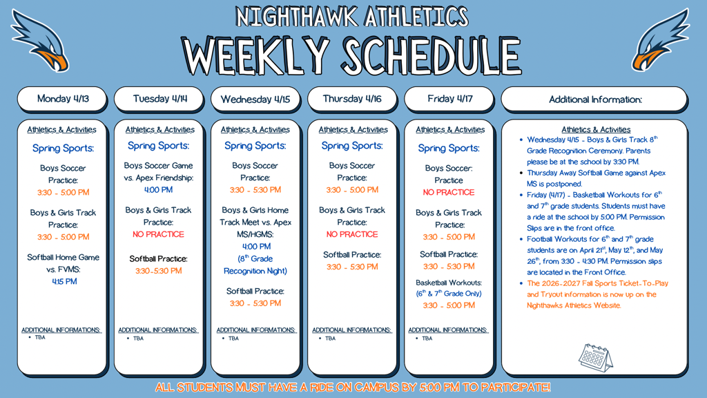 As we kick off the Spring Sports Season, it’s also time to look ahead to next year! We invite you to support our Nighthawk Athletics program by contributing to our Booster Club. This fundraiser will specifically help us purchase new football uniforms, and any additional funds raised will go towards supporting our other programs, including new jerseys and equipment for our soccer and softball student- athletes.